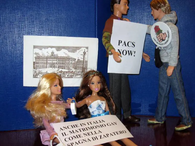 Roma - La Madonna, San Giuseppe vicino al bambino Gesù tra il bue e l’asinello. E accanto, fra i pastorelli, anche due coppie gay. Quella lesbica rappresentata da due bambole Barbie abbracciate e quella omo da due Ken, ovvero nella tradizione il fidanzato di Barbie. Al collo dei bambolotti due cartelli. Per le Barbie la scritta «Anche in Italia il matrimonio gay come nella Spagna di Zapatero» e per la coppia di Ken «Pacs Now».