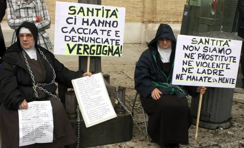 Grana sindacale per papa Ratzinger. Due anziane monache di clausura incatenate a un lampione. In piazza San Pietro, prima dell’Angelus, davanti a fedeli un po’ basiti e a telecamere piuttosto eccitate. Difficile capire se all’origine della plateale manifestazione ci sia una fede incrollabile, o semplicemente l’età che avanza. Resta la motivazione: le due religiose chiedono vigorosamente di tornare nel proprio convento di clausura, da dove qualcuno - dicono - le ha «buttate per strada come sacchi di pattume, dopo rispettivamente cinquanta e sessant’anni di vita monastica».
