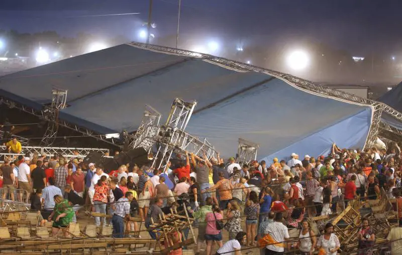 La violenta raffica contro il palco L’Indianapolis Star sostiene che al momento del crollo del palco le raffiche di vento raggiungevano la velocità di 96Km all’ora. Il quotidiano scrive che al concerto c’erano 12.000 persone. Su Youtube circola un video amatoriale nel quale si vede la violenta raffica che ha scaraventato giù il palco. Testimoni riferiscono del panico diffusosi tra la folla e che tanti tra gli spettatori hanno cercato di tirare fuori dalle macerie le persone che erano rimaste intrappolate. Poco prima della tragedia, non appena il forte vento aveva cominciato ad alzarsi, il capitano Brad Weaver della polizia di Stato dell’Indiana aveva diffuso un messaggio di allerta. Giusto il tempo di ripararsi e, ha raccontato, "ho visto l’impalcatura che cominciava a venire giù".