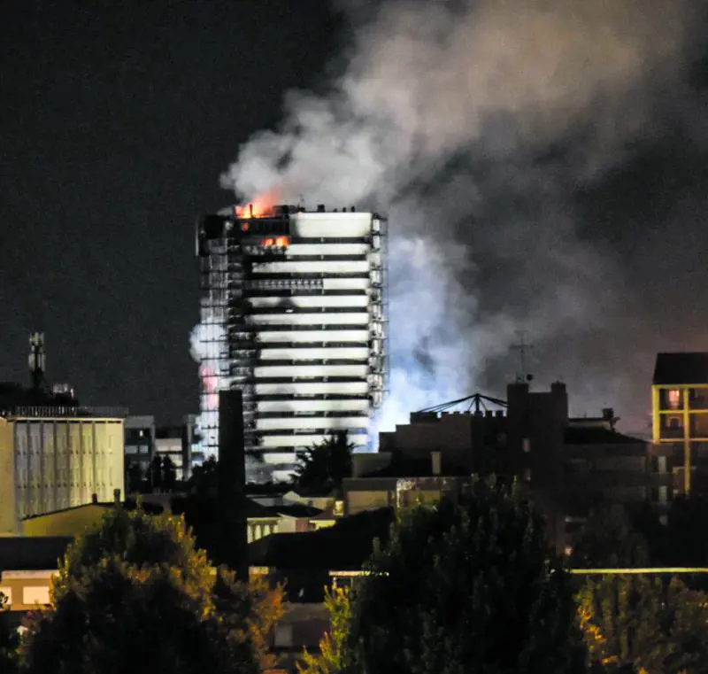 Il materiale venduto come ignifugo si rivelò, alla prova dei fatti, drammaticamente combustibile e bastò un piccolo spunto iniziale - un mozzicone di sigaretta - per incendiare l'intero stabile. La Torre dei Moro bruciò a lungo e le immagini impressionanti fecero il giro del web. Solo l'orario diurno e la stagione feriale permisero che nessuno restasse intrappolato e l'unica vita andata persa fu quella di un povero gatto. Ma i danni materiali furono ingenti, sia allo stabile che ai beni degli inquilini che andarono in buona parte distrutti. E da allora i lavori di recupero sono ancora in corso, con gli abitanti che ancora non sanno quando potranno rientrare nelle loro case.
