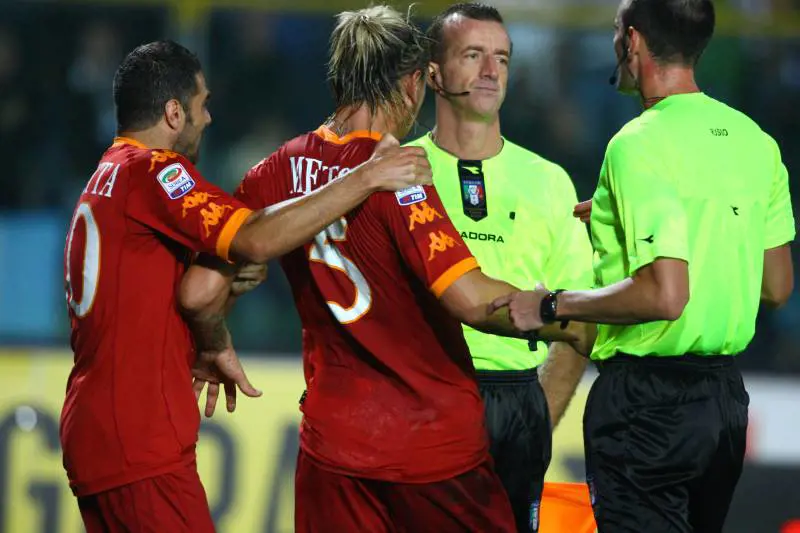 Alla ripresa la Roma ha presentato Adriano al posto di Menez. E il brasiliano ha provato subito a collaudare il suo famoso mancino con una conclusione dal limite, ma il pallone è passato mezzo metro oltre la traversa. Altra decisione della panchina giallorossa: dentro Baptista e fuori Vucinic, ma non c’è stato il tempo di constatare l’efficacia della sostituzione perché su un lungo rilancio Eder è entrato in area affiancato da Mexes che in scivolata ha messo in angolo, che Russo ha subito concesso. Ma dal guardalinee è arrivata la segnalazione: rigore. E secondo giallo per il difensore romanista, costretto alla doccia anticipata. Apriti cielo: proteste vibrate dei giallorossi, rabbia feroce di Mexes con calcione ai tabelloni pubblicitari. Niente da fare: dal dischetto Caracciolo non ha perdonato. A questo punto, con la folla di casa impazzita di gioia e la depressione del manipolo di tifosi romanisti isolati in curva sud, il Brescia ha richiamato Diamanti e Caracciolo per far posto a Konè e Possanzini.