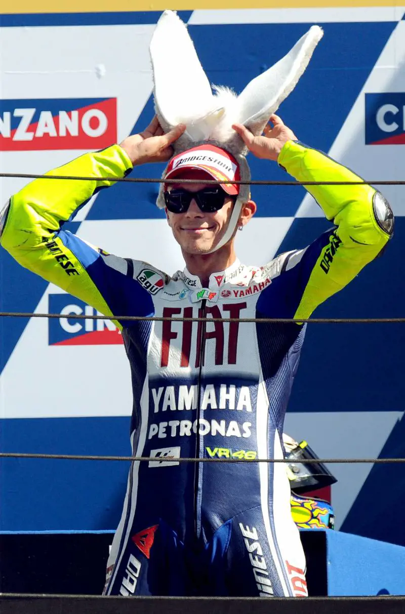 Soddisfatto, insomma pensando che alla fine quel somaro gli ha portato bene, tanto che è salito sul podio del Gp di San Marino e della Riviera di Rimini con in testa, oltre al cappellino del vincitore, anche due lunghe orecchie da somaro di peluche. Ma quando è suonato l'Inno di Mameli, le orecchie sono sparite... Poi è bastato alzare il dito indice in segno di "numero 1" ed è stata ovazione.