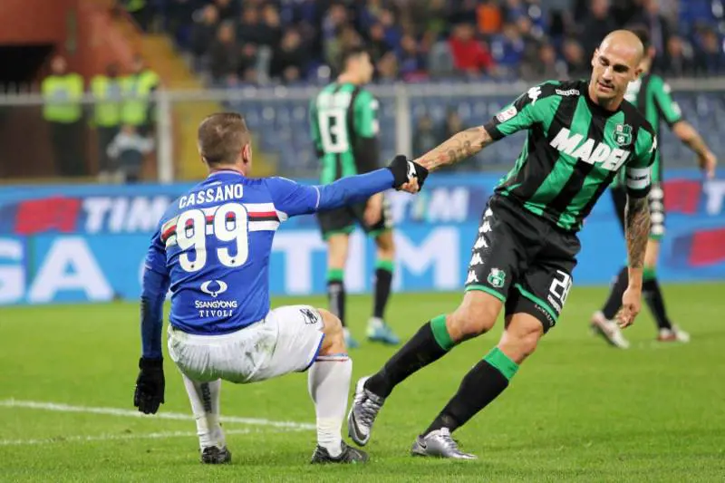 Montella rilancia dal primo minuto Cassano accanto a Eder. Solo panchina per Muriel. Per gli emiliani, che devono ancora rinunciare allo squalificato Berardi, tridente composto da Politano, Floccari e Sansone. I neroverdi appaiono in palla fin dalle prime battute. Al 6' Laribi centra in pieno il palo su un cross proveniente dalla corsia mancina. Due minuti dopo arriva il vantaggio degli ospiti: Politano mette in mezzo un pallone invitante dalla destra, Acerbi anticipa tutti e con una deviazione da bomber di razza sblocca il risultato. La Sampdoria non riesce a reagire e al 27' capitola ancora: bella azione corale degli emiliani, la palla sulla destra finisce a Vrsaljko il cui traversone rasoterra viene raccolto da Floccari, che da centro area si gira e batte Viviano complice una deviazione di Barreto che mette fuori causa il portiere blucerchiato. Al 35' Floccari sfiora la doppietta personale, ma in quest'occasione Viviano risponde presente. Il Sassuolo in ogni caso continua a dominare la partita, e l'occasione sprecata à solo il preludio al terzo gol, che arriva puntuale al 38'. Il giovane classe '96 Pellegrini sfonda per vie centrali, calcia una prima volta facendosi respingere la conclusione da Viviano, ma sul tap-in non fallisce il bersaglio realizzando il 3-0. La Samp del primo tempo è tutta in una conclusione sul finire del primo tempo di Eder, il cui diagonale rasoterra finisce di pochissimo a lato.