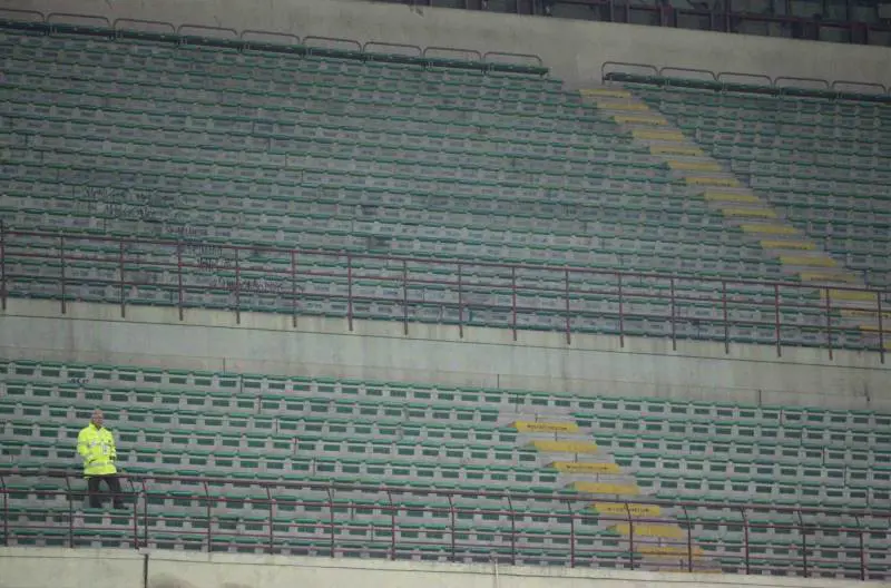Milano - Può esistere il calcio senza i tifosi? La risposta ovviamente è no. E ogni volta che si disputa una partita a porte chiuse se ne ha la dimostrazione evidente. Di partite a spalti vuoti, purtroppo, se ne sono viste parecchie in questi ultimi anni, e sempre per la solita ragione: le squalifiche comminate alle squadre per le intemperanze dei tifosi. Non era mai capitato, però, che fosse squalificata una curva. E' accaduto all'Inter, dopo gli striscioni offensivi esposti da alcuni suoi tifosi contro i supporters del Napoli. Il giudice sportivo ha voluto usare la mano pesante, l'Inter ha provato a fare ricorso ma niente da fare. Inter-Genoa, ieri sera, si è giocata con la curva nord - quella tradizionalmente occupata dagli ultras nerazzurri - completamente vuota. Partita senza tifo? Decisamente no. Prima di tutto perché i tifosi del Genoa erano presenti - e belli arzilli - nello spazio loro assegnato (primo anello blu). Ma non è stato, quello del Meazza, un tifo a senso unico. Gli ultras dell'Inter non hanno lasciato soli i loro beniamini. Si sono trasferiti in massa nella "curva sud". E da lì hanno fatto il tifo. Situazione per certi versi paradossale: gli ultras di due squadre rivali seduti gli uni sopra gli altri, nella stessa curva. Cose mai viste. E a garantire la sicurezza, un piccolo esercito di "steward" vestiti di giallo.