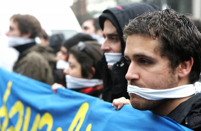 In platea c’è solo Christian Bonafede che avrebbe dovuto pronunciare il saluto al Papa e che invece è rimasto polemicamente imbavagliato ed in silenzio. «Oggi il re è nudo», dice poi Christian a cerimonia conclusa. Poi ci sono gli altri giovani in galleria che espongono il cartello «Libertà in Università. E pur si muove», citando la frase attribuita a Galileo. Tra loro Valentina, che ha 22 anni frequenta Giurisprudenza e definisce l’Università «una discarica ideologica» dove «vengono invitati a tenere discorsi ex terroristi e poi si mette a tacere il Papa». Hanno stampato un volantino dove si legge: «I Papi hanno potuto parlare ovunque nel mondo. L’unico posto dove il Papa non può parlare è la Sapienza».