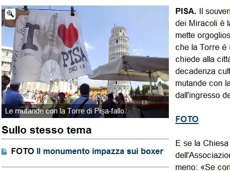 Le mutande vanno a ruba In effetti non era mai capitato prima che il celebre campanile progettato da Bonanno Pisano venisse rappresentato al posto di un membro. L'immagine irriverente è stampato su slip e boxer venduti come souvenir a 7 euro il paio. L’oggetto sta andando a ruba, ovviamente visto che se ne parla tantissimo, sia fra i turisti italiani che stranieri. Una delle bancarelle che vende questi slip è a poche decine di metri dall’ingresso dell’Arcivescovado. L’arcidiocesi è sul piede di guerra. "Quei souvenir - tuona il vicario diocesano, monsignor Enzo Lucchesini - sono una vergogna, non solo per i fedeli ma per tutta la città. È un’assoluta mancanza di rispetto, queste forme di pubblicità sono un segno di decadenza dei nostri tempi"...