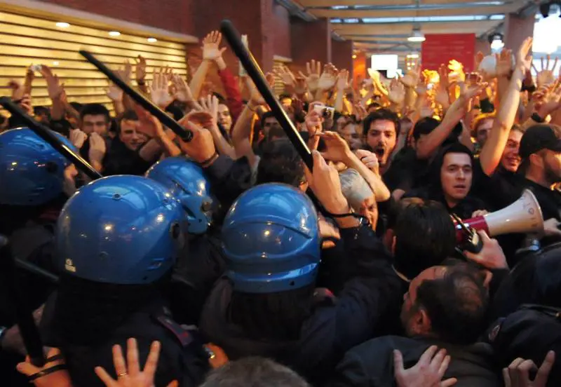 Blitz al festival del film di Roma Al grido "Non abbiamo paura di voi" un folto gruppo di ragazzi ha iniziato a manifestare di fronte all’ingresso dell’Auditorium Parco della Musica. Di fronte, schierate in tenuta anti sommossa, le forze dell’ordine. "Vergogna, vergogna" gridano i manifestanti e ancora "mafiosi". Intanto i cancelli dell’Auditorium dove erano in corso le iniziative legate al Festival Internazionale del Film di Roma sono stati bloccati e le persone fatte allontanare. Secondo quanto si apprende dalla questura di Roma, "non si sono registrate cariche". Secondo uno dei ragazzi presente al corteo, invece, gli studenti sono stati "presi a manganellate".