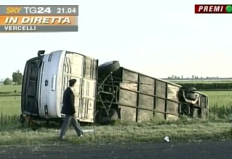 L'autista, Michele Epifani, trentenne, forse a causa di un colpo di sonno o di un improvviso malore, ha perso il controllo del mezzo. L'autobus ha prima slittato sull'asfalto, i segni neri delle gomme in frenata sottolineano il disperato tentativo dell'uomo di non finire fuori strada. Inutile: l'autobus è andato in testacoda e si è ribaltato più volte, fermandosi poi sul fianco destro. A bordo il panico. Un'insegnante con il telefono cellulare ha chiamato i soccorsi. Sul posto sono intervenuti i vigili del fuoco di Vercelli, la polizia stradale di Casale Monferrato e decine di ambulanze del 118.