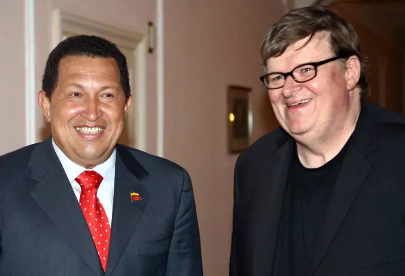 La storia risale ai giorni del festival del Cinema di Venezia, bolso appuntamento lagunare che aveva visto Moore presentare il suo film più recente, Capitalism, e il signorotto di Caracas calarsi negli insoliti panni di promoter di South of the border, ultimo documentario di Oliver Stone. Andando però così anche a raccogliere, specie il secondo, il tifo delirante della gauche cinefila (quasi mi scappava «cinofila») accorsa ad acclamarlo in un tripudio di bandiere rosse con l’effigie del povero e incolpevole Che Guevara (comunque la si pensi, lui sì un eroe autentico).