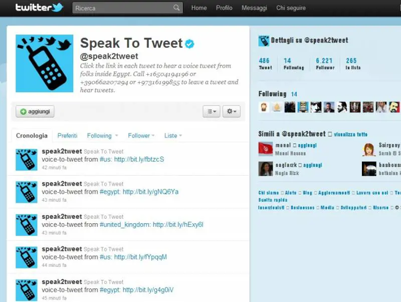 Non serve connessione "Non è necessario alcuna connessione a internet. La gente può ascoltare i messaggi componendo gli stessi numeri di telefono o andando (sul sito web) twitter.com/speak2tweet, ha aggiunto. "Speriamo che questo contribuisca ad aiutare la gente in Egitto a restare connessa in questo periodo molto difficile. Pensiamo a tutti laggiù".