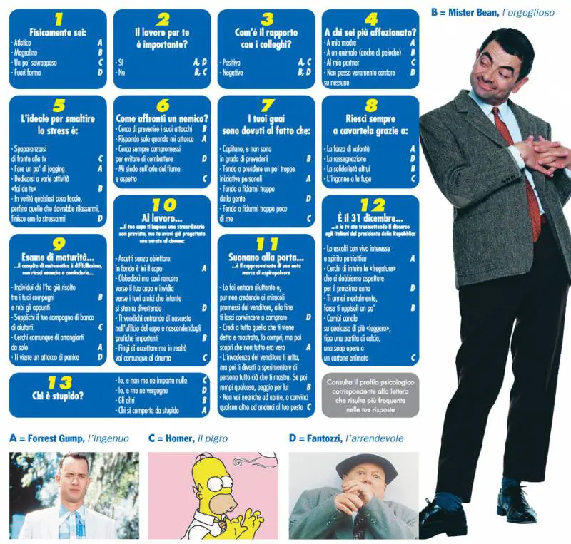 Un capitolo a parte sarebbe da dedicare allo stupido che si sente un genio: una mina vagante destinata a esplodere improvvisamente: in ambito familiare, sul luogo di lavoro, tra amici o semplici conoscenti. Riconoscerli (o riconoscerci) sarebbe il massimo. Il mensile Focus ci ha provato stilando un test scientifico con 13 domande «rivelatrici». Dopo aver risposto è previsto però un unico verdetto: «Stupido!». Anche se - a parziale «consolazione» - si potrà scegliere tra ben «quattro profili psicologici»: «A», corrispondente a Homer Simpson; «B», a Fantozzi; «C» a Forrest Gump; «D» a Mister Bean. Quattro super stupidi, con il pregio almeno di essere simpatici ciascuno a suo modo. Ma lo stupido che si muove nel mondo reale è davvero assimilabile a personaggi della fiction? Sul punto anche gli esperti mostrano di nutrire più di un dubbio. «Storicamente la stupidità è una piaga che affligge l’umanità - afferma lo storico ed economista, Carlo Cipolla -. Non potremo mai sconfiggerla del tutto, ma i suoi effetti possono essere meno gravi se capiamo come funziona». Cipolla ha individuato tre caratteristiche per «prevenire e curare»: La prima: «La stupidità è inconsapevole e recidiva».
