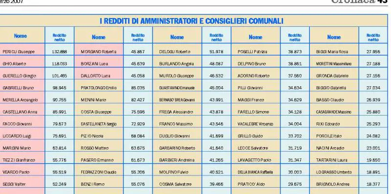 Nella giunta rossa che guida palazzo Tursi al quarto posto spicca Bruno Gabrielli, architetto e docente universitario, assessore all'urbanistica, che dichiara 155mila euro all'anno, quinto l'assessore al Traffico Arcangelo Merella, dello Sdi, dirigente in aspettativa della Regione, con 142mila euro, sesto l'assessore alla promozione della città Anna Castellano, Ds, dirigente della società di pr Metis, con 133mila euro, settimo l'assessore al personale Giovanni Facco, dirigente aziendale Techint, con 124mila euro, ottavo l'assessore al bilancio Luigi Liccardo, commercialista, con 115mila euro, nono l'assessore allo sviluppo economico Mario Margini, dirigente Ds, con 89mila euro, decimo l'assessore ai rifiuti Gianfranco Tiezzi, Margherita, amministratore della Geam, con 83mila euro, undicesimo l'assessore al sociale Paolo Veardo, ingegnere dirigente di una società che si occupa di energia, con 83mila euro, dodicesimo l'assessore alle acque Valter Seggi, ex Prc, funzionario Amga, con 70mila euro, tredicesimo l'assessore alla scuola Andrea Sassano, unione di sinistra, consulente aziendale, con 71mila euro, quattordicesimo l'assessore all'edilizia privata Roberta Morgano, Ds, con 64mila euro, quindicesimo l'assessore alla cultura Luca Borzani, Ds, curatore dell'archivio Ansaldo, con 65mila euro, sedicesimo e fanalino di coda l'assessore a tempo pieno all'ambiente Luca Dallorto, verdi, con 63mila euro.