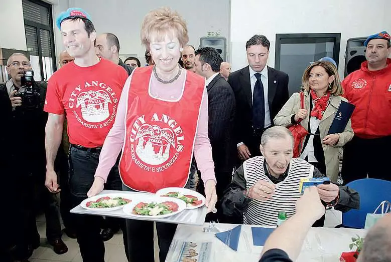 Ha servito in tavola bresaola con rucola e grana, sulle note di «Io vagabondo» dei Nomadi. Pettorina rossa dei City Angels al posto del grembiule, il sindaco Letizia Moratti ieri ha fatto per un giorno la cameriera ai clochard ospiti della casa di accoglienza del Comune in viale Ortles. Un appuntamento fisso quello organizzato alla mensa dei poveri dall’associazione, a cui hanno partecipato anche quest’anno una quarantina di vip, da Roberto Vecchioni a Tony Dallara, Enrico Beruschi, Marco Bellavia, Jo Squillo, Leone di Lernia, personaggi delle ultime edizioni di «Amici» e del «Grande fratello», gli assessori comunali Mariolina Moioli, Giampaolo Landi di Chiavenna, Andrea Mascaretti e il presidente del consiglio provinciale Bruno Dapei e gli assessori Stefano Bolognini e Silvia Garnero. L’«Angel Day», ha ricordato il presidente Mario Furlan, «ha lo scopo di sensibilizzare i cittadini sull’importanza della solidarietà e puntare i riflettori non sulle star che servono ai tavoli ma sulle persone che vivono ogni giorno nell’ombra».