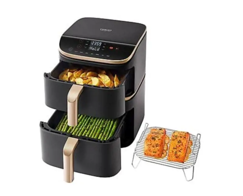 Il punto forte, poi, è il design verticale: invece di occupare molto spazio in larghezza, sfrutta l’altezza e permette di cucinare su due livelli indipendenti. Questo la rende adatta a famiglie, cucine piccole o a chi usa spesso la friggitrice per preparare più pietanze insieme e non vuole per forza accendere il forno tradizionale.
