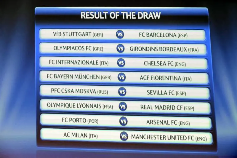 Gli ottavi Questi gli accoppiamenti: Stoccarda-Barcellona, Olympiacos-Bordeaux, Inter-Chelsea, Bayern Monaco-Fiorentina, Cska Mosca-Siviglia, Lione-Real Madrid, Porto-Arsenal, Milan-Manchester United. Gli ottavi si disputeranno su sfide di 180 minuti. Le gare di andata si disputeranno il 16-17 e il 23-24 febbraio, mentre gli incontri di ritorno sono fissati il 9-10 e il 16-17 marzo. Per le italiane sarà il Milan a giocare per primo ospitando il Manchester United martedì 16 febbraio prossimo, la partita di ritorno in Inghilterra si giocherà mercoledì 10 marzo. Inter-Chelsea si giocherà mercoledì 24 febbraio, con il ritorno martedì 16 marzo. Le date di Bayern Monaco-Fiorentina sono invece mercoledì 17 febbraio (andata in Germania) e martedì 9 marzo (ritorno al Franchi).