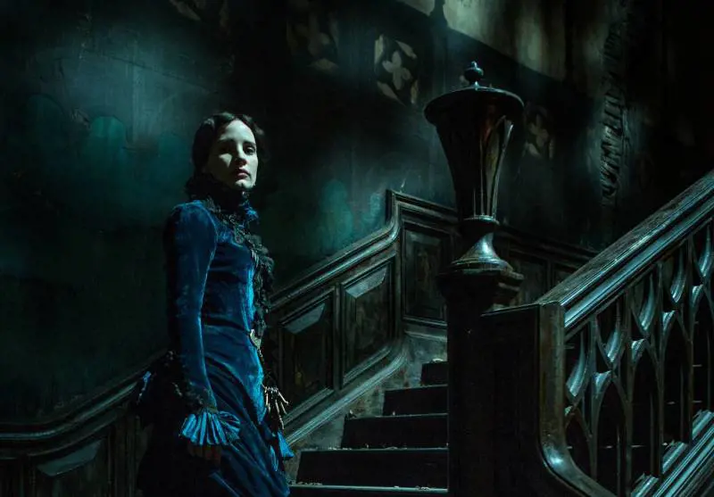 Dopo il matrimonio lo segue in Inghilterra, andando a vivere con lui e la sua cupa sorella Lucille (Jessica Chastain) nel loro immenso maniero decadente che, a causa di una particolare polvere rossa che si trova nel sottosuolo, macchia di color sangue la terra innevata circostante, dando il nome di Crimson Peak alla zona. Edith scoprirà presto che eventi terribili sono accaduti e continuano a compiersi in quei luoghi. Non è tanto la storia a restare impressa, quanto l'esperienza estetica che il film è in grado di regalare in virtù di quello che, sotto il profilo stilistico e visivo, è il risultato di una grande ricercatezza: fotografia suggestiva, scenografie dalla bellezza pittorica, costumi sontuosi ed eleganti. La landa desolata con al centro la gigantesca casa in rovina costituisce il set mozzafiato di un carosello di fantasmi, orribili segreti e passioni proibite. Indubbiamente ricorrono numerosi dejà vu durante la visione del film perché "Crimson Peak", oltre ad echeggiare la fiaba popolare di Barbablù, nasce intriso di citazioni a un passato cui rende omaggio proprio rievocandolo: da un lato la letteratura gotica nella sua declinazione horror con riferimenti ad autori come Edgar Allan Poe e Howard P. Lovecraft e in quella romantica in stile "Cime tempestose", dall'altro il cinema classico di certe ghost story ma anche di alcuni titoli di Hitchcock e Kubrick.