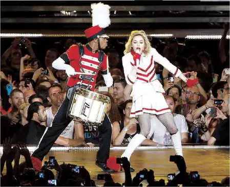 Ed è sempre stata obbligata a restarlo. Ad esempio, qui tra Like a virgin e I’m addicted sullo schermo il suo volto (con un tecno collage) prende le sembianze di Hitler, del Papa, di Marine LePen, di Sarah Palin ( ma che c’entra qui?). Megalomania choccante. Adesso ormai lei è la popstar on demand. Madonna pay per view. Deve stupire. E creare tendenza, altrimenti il pubblico ci rimane male. E allora anche in questo show su di un palco smisurato è impegnata a ridicolizzare le presunte eredi. O almeno tentare di farlo. Sempre. Ecco Revolver (con pistola puntata sul pubblico). Poi Gang bang (rissa con colpo di pistola finale a un ballerino:«Vado dritta all’inferno, ho un sacco di amici lì»), Papa don’t preach e ancora la scatenata Hung up . E I don’t give a ... che lei suona con un chitarrone in bella mostra.Il tutto un po’ dark,tendenza gothic. Quando inizia Express yourself tra il pubblico corre un fremito diverso.