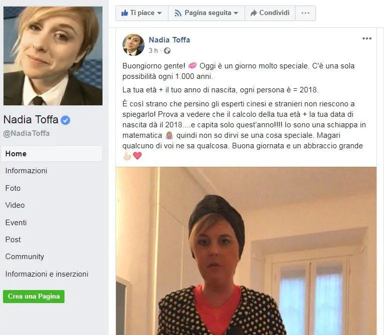 “Buongiorno gente! - si legge - Oggi è un giorno molto speciale. C'è una sola possibilità ogni 1.000 anni. La tua età + il tuo anno di nascita, ogni persona è = 2018. È così strano che persino gli esperti cinesi e stranieri non riescono a spiegarlo! Prova a vedere che il calcolo della tua età + la tua data di nascita dà il 2018....e capita solo quest’anno!!!! Io sono una schiappa in matematica, quindi non so dirvi se una cosa speciale. Magari qualcuno di voi ne sa qualcosa. Buona giornata e un abbraccio grande”.