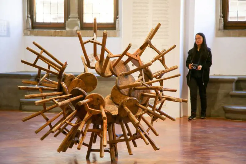 Questa estetica del dolore non è - per fortuna - il tratto saliente della mostra: il genius loci ha fatto il suo lavoro, regalandoci un Ai Weiwei capace di guizzi alla maniera dei rinascimentali. Prendiamo l'ingresso al piano nobile, ad esempio, dove Forever, cattedrale di biciclette assemblate ad hoc (l'odore di gomma stordisce) strizza l'occhio ai ready-made di Duchamp. «Essere qui è un po' come tornare bambino, quando ammiravo sui libri di mio padre le figure del Botticelli. Oggi sono stato all'Opificio delle Pietre Dure: come non ammirare l'opera degli antichi maestri?», racconta. La mostra va letta nel serrato confronto fra arte di oggi e arte di ieri: ci sono i vasi antichi riverniciati, gli studi prospettici (il punto di fuga lo indica in modo dissacrante il dito medio), la suggestiva sala con le figure della mitologia cinese, l'amore per l'antiquariato (Grapes compone 34 sgabelli di legno, simbolo di una Cina che non c'è piu).