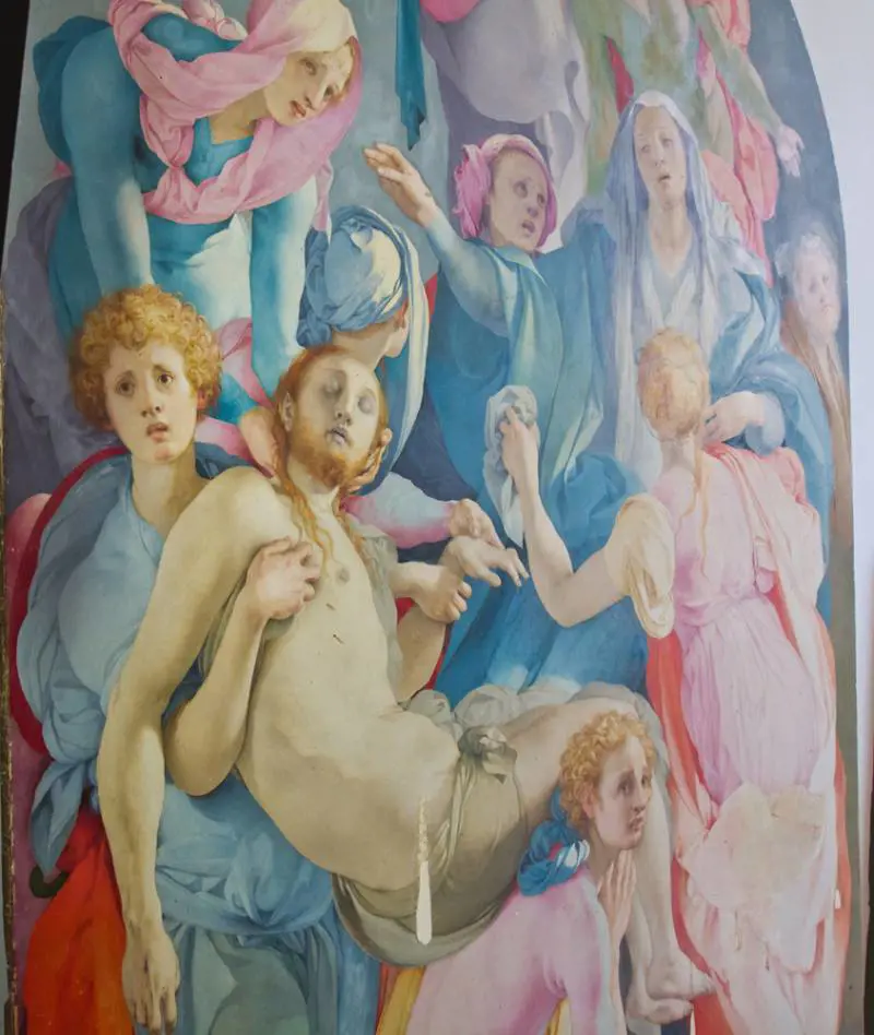 A vederla finalmente ripulita (dalle polveri, dai tarli), lascia senza parole. L'umbratile e ossessivo Pontormo (primo artista a redigere un diario alimentare: Vanessa Beecroft si è ispirata a lui) era, dice Rossi, «uno studioso del nuovo, uno sperimentatore». Tutti sceglievano la pittura a olio? Lui opta per la tempera a uovo. Lo ha scoperto proprio Rossi in questi mesi di frequentazione ravvicinata col dipinto. Mescolata a colori minerali (come l'azzurrite, tratta dal rame) e lacche, la tempera crea, complice la pennellata sminuzzata, una pittura di luce, sconcertante per l'epoca. Incurante dei gusti della committenza, Pontormo si perde tra insolite campiture di colore: rosa, azzurrino, un filo di rosso come contorno delle mani. E fa vesti senza polsini, «quasi fossero tute adamitiche tatuate sulla pelle», commenta Rossi. Una Deposizione in cui nessuno si cura del corpo di Cristo, in cui non c'è la tomba, che deposizione è? «È un'opera sul dolore di chi resta, filtrato dalla Maniera, intesa come modo autonomo e originale di rappresentare il mondo», chiosa Daniele Rapino della Soprintendenza.