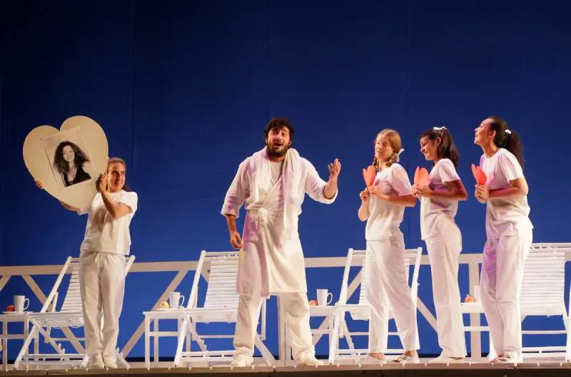 Un caso più unico che raro. Dove trovare un altro titolo d'opera che da diciassette anni vada ininterrottamente in scena nello stesso festival? E non parliamo qui di Traviata o Bohéme; ma di un titolo che, lungi dal possedere analoga popolarità, era anzi rimasto sconosciuto ai più per 160 anni, prima di essere clamorosamente riscoperto nel 1984 dal Rossini Opera Festival. Da allora Il viaggio a Reims di Rossini è divenuto non solo il fiore all'occhiello della prestigiosa rassegna pesarese, ma anche il più curioso caso di «replica infinita» del mondo dell'opera. «Pur essendo stato scritto per i più grandi cantanti dell'epoca di Rossini, e poi riesumato dai più grandi del periodo 1980 (Gasdia, Valentini, Ricciarelli, Raimondi, Ramey, Dara, Nucci) Il viaggio a Reims che dal 2001 ogni estate viene replicato a Pesaro è affidato ai giovani allievi dell'Accademia Rossiniana Alberto Zedda - racconta Elisabetta Courir (cui ogni volta spetta riallestire la regia originale di Emilio Sagi)- Ma non si tratta di una contraddizione. Semmai è la prova dell'alto livello di questi giovani interpreti. Eventuali loro acerbità, infatti, sono compensate da una freschezza trascinante e da talenti spesso sorprendenti: non a caso alcune star odierne del canto rossiniano, come Olga Peretyatko, Marianna Pizzolato o Yijie Shi, sono venute fuori proprio da nostri Viaggio a Reims».