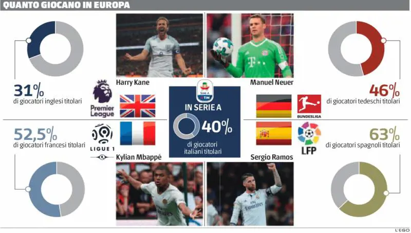 E anche Deschamps può sorridere: oltre il 52 dei francesi (sono il 54 nelle rose) ha giocato titolare fisso nelle prime 4 gare di Ligue 1, anche se la sua Nazionale è costruita soprattutto su giovani e senatori che non giocano in patria. Le eccezioni sono il pezzo pregiato Mbappé e il compagno di squadra Areola, il futuro in porta già protagonista nella sfida con la Germania. Mancini lamenta lo scarso utilizzo di italiani fra i titolari in A, ma qualche grattacapo se lo pone anche Southgate: solo il 31 per cento (sul 33) degli inglesi sta giocando dal 1' e nell'ultimo turno si è scesi addirittura al 30. Eppure, nell'ultimo Mondiale, il ct dei Tre Leoni aveva composto il mosaico dei 23 - quarto al traguardo - con giocatori della Premier tra cui i già affermati baby Alli, Rushford e Alexander-Arnold oltre al 25enne Kane.