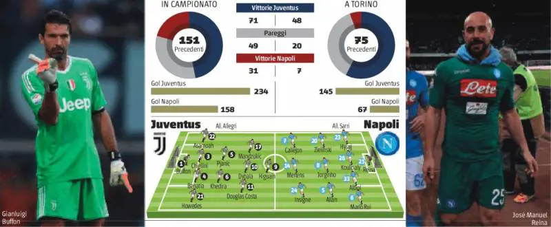 Uno scudetto per due. Juventus e Napoli si guardano in faccia dopo trentatré giornate di sorpassi e controsorpassi, fughe e fughine compreso l'incrocio d'andata marchiato dal grande ex Higuain. È l'appuntamento con la storia: i bianconeri per il settimo trionfo consecutivo, gli azzurri per mettere fine alla dittatura bianconera. La sfida dello Stadium ci racconterà una verità, forse non la verità con la «v» maiuscola. Per Massimiliano Allegri la vittoria sarebbe un'ipoteca tricolore; Maurizio Sarri sbancando il fortino bianconero capovolgerebbe l'inerzia, andando a meno uno. Dopo quelle di Cristiano Ronaldo e Simy, sarebbe un'altra rovesciata che lascerebbe il segno sulla stagione della Signora. E se finisse pari e patta il titolo rimarrebbe in sospeso con il vantaggio dello scontro diretto ai campioni d'Italia. Sarebbe la via di mezzo in una notte che altrimenti regalerebbe sentimenti opposti: trionfo o grande paura di rimonta per la Juve; sogno o resa per il Napoli.