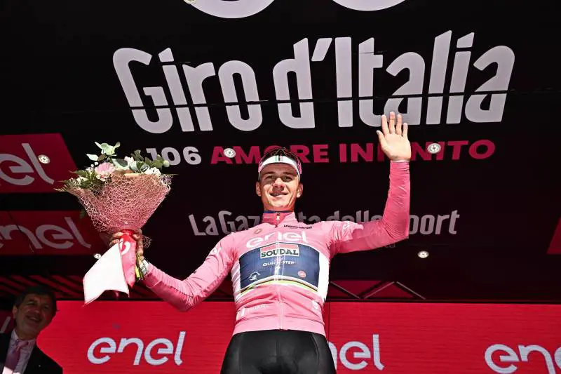 «Portare in giro questa maglia mi inorgoglisce: la indosso dalla partenza, vediamo cosa dirà la corsa, le possibilità che possa lasciarla ad altri sono cinquanta e cinquanta», dice lui dietro la mascherina rossa, prima di scherzare su Remco, perché ti amo, la canzone che i suoi tifosi gli hanno dedicato in patria. «Non l'ho ascoltata per scaramanzia, magari lo farò a Roma: in Belgio impazziscono davvero per poco...». Ma non ce la racconta giusta.