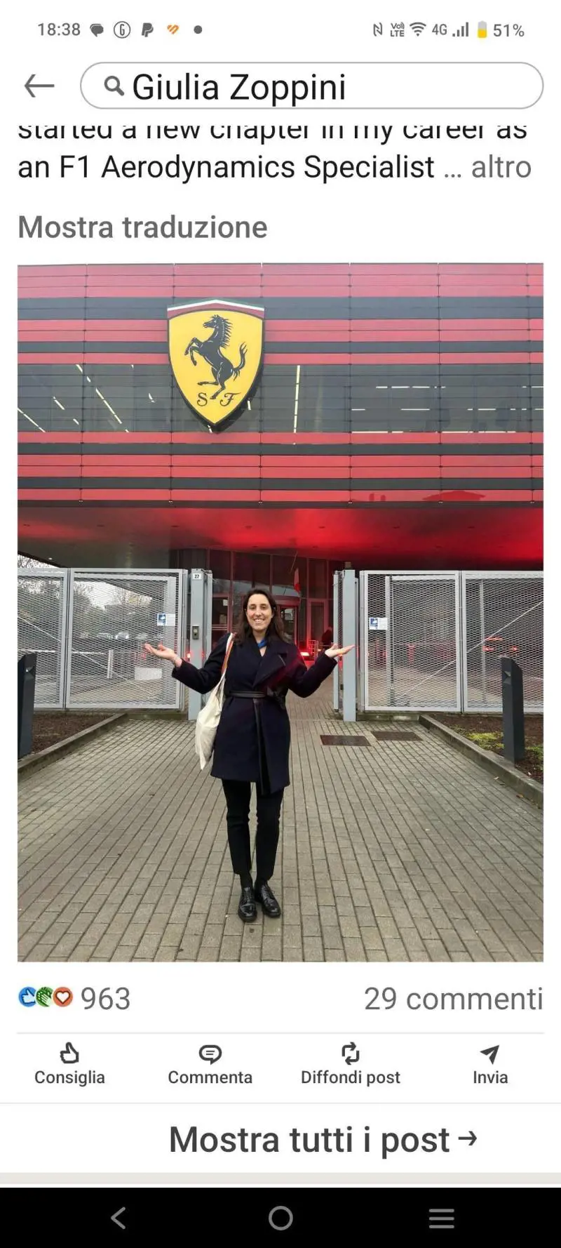 E infatti lei è arrivata in Ferrari dopo due anni a Brackley. "È stata un'esperienza davvero impegnativa ma gratificante che mi ha spinto fuori dalla mia zona di comfort", ha raccontato sempre su LinkedIn, una piattaforma che scommettiamo comincerà a usare meno nei prossimi mesi.