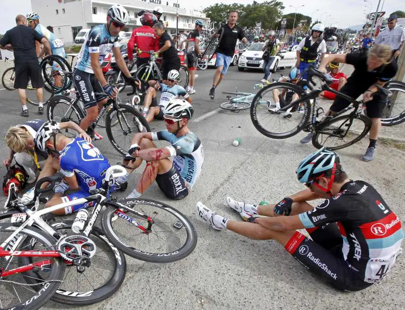 Intanto a 12 chilometri una prima caduta coinvolge il vincitore del Giro Ryder Hesjedal e il giovane Moreno Moser, poi una seconda caduta a sei chilometri vede finire a terra almeno sessanta uomini: tra questi Cavendish, Gilbert, Sagan e Greipel, tutti uomini veloci, che ambivano alla prima maglia gialla. Nella maxi-caduta rimane coinvolto anche Alberto Contador con Tejay van Garderen: una piccola ecatombe.