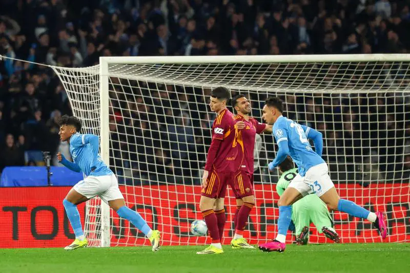 Il pareggio del Maradona non stravolge la lotta Champions, regala un punticino in più a Napoli e Roma sulla Juventus ed è un risultato giusto perché entrambe la potevano vincere ma anche perdere. Il primo tempo racconta di una Roma partita meglio, con maggior velocità nel palleggio e letale nelle ripartenze: Zaragoza brucia Buongiorno sulla fascia e Malen fa altrettanto con Beukema, piazzando la facile deviazione vincente. Sul centravanti giallorosso la difesa di Conte palesa evidenti difficoltà anche nell'alternanza della marcatura, al punto che l'olandese con altri due spunti personali mette i brividi a Milinkovic che se lo vede sbucare ovunque in area. Il Napoli impiega non poco tempo per iniziare a ragionare alla sua maniera e nel trovare le giocate giuste per uscire dalla morsa delle marcature individuali ordinate da Gasperini, speranze concentrate sulla fantasia di Vergara e sulla profondità di Hojlund: un dominio sterile perché i partenopei non sfondano a destra, allora la fase offensiva viene catalizzata a sinistra dove Spinazzola crea grattacapi a Celik, non a caso è proprio l'esterno a poco dall'intervallo a rimettere le cose in parità con un destro da fuori area deviato da Pisilli.