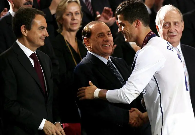 Insomma, non cè molto spazio per sognare. Anche se quando il numero uno del Milan si mette in testa un giocatore, difficilmente si arrende al primo ostacolo. Ronaldinho docet. Come per il brasiliano, il corteggiamento a Ronaldo è iniziato da lontano. Roma, stadio Olimpico, finale di Champions League 2008/09. CR7 è la stella del Manchester United opposto al Barcellona di Lionel Messi. Berlusconi, in qualità di premier del paese ospitante, è seduto tra i palchi donore. I Red Devils vengono sconfitti, ma il Cavaliere si innamora del modo di giocare del portoghese. Tanto che a fine partita, durante la cerimonia di consegna delle medaglie, lo ferma e lo abbraccia affettuosamente per consolarlo. Le telecamere immortalano lincontro, con Ronaldo che ride alle battute dellallora presidente del Consiglio. Prove di feeling? Lo stesso Berlusconi dirà poi di aver confidato a Cristiano di volerlo portare al Milan. Prima o poi.
