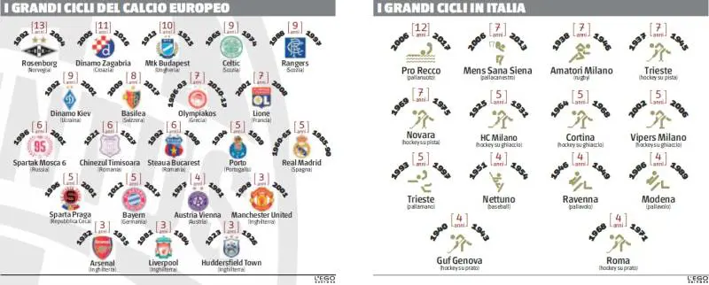 Non si sa più niente di Genova e Roma che nell'hockey su prato hanno vinto 4 volte di fila, come Nettuno con la sua quaterna dorata del baseball, nel 1951-54, che soltanto il Milano di Gigi Cameroni ha tentato di eguagliare, ma senza arrivare oltre il terzo titolo consecutivo, vincendone tanti, ma non in serie come ha fatto la pallamano di Trieste, 5 successi per una città che ha avuto gloria e campioni dalla pallanuoto al basket, al nuoto. Campioni a cui si deve brindare: gloria alla Juventus e alle sorelle dominanti, senza farsi ubriacare dall'invidia, ma cercando di copiare e di farlo bene.