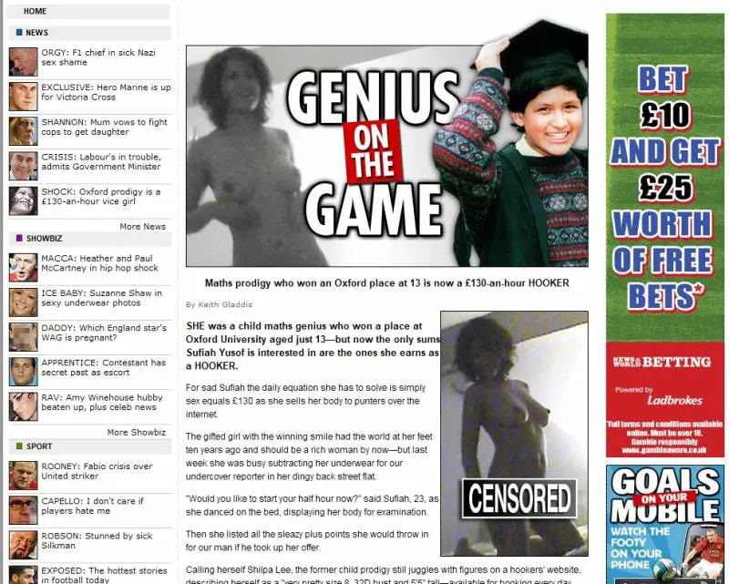 La sconcertante parabola della bella Sufiah Yusof è stata raccontata con un corredo di eloquenti fotografie dal tabloid News of the World che punta il dito accusatore contro il soffocante, oppressivo padre, Farooq, appena condannato a 18 mesi di carcere per atti osceni a spese di due teenagers. Lui, professore di matematica, addestrò la figlia al punto da farne a 13 anni un piccolo mostro con i numeri e le equazioni ma dopo tre anni di università lei piantò tutto e fuggì di casa perché non poteva più sopportare gli abusi "fisici ed emotivi" del genitore.