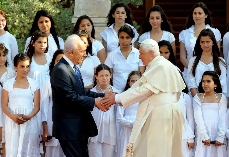 Nel pomeriggio, prima della visita allo Yad Vashem, Benedetto XVI ha fatto una visita di cortesia a Peres nel palazzo presidenziale. Tra gli invitati al ricevimento anche il fondatore della Geox Moretti Polegato. Ratzinger ha parlato della sicurezza, spiegando che essa si ottiene solo promuovendo la giustizia e la pace. E non violando mai i valori e i diritti umani universali. Accenno velato alle sofferenze del popolo palestinese.