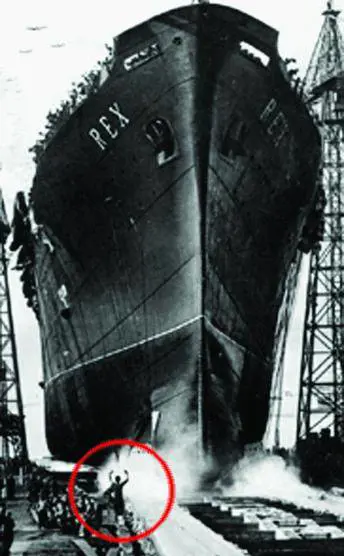E sicuramente qualcuno può aver notato che, mentre la nave sta scendendo velocemente verso il mare, un operaio, con un gesto premeditato, si stacca dagli altri 100 mila presenti, fra i quali la regina Elena, e salta sull'invasatura a salutare la nave a braccia alzate, come un attore che voglia esibirsi. Di chi mai sarà quella sagoma che ha destato tanta curiosità al punto che la rivista Arte Navale, nel numero 13 del 2 luglio 2002, la mette addirittura nella pagina di apertura e la inserisce in un riquadro rosso nella foto del varo della pagina successiva? Ebbene, con un pizzico di soddisfazione, possiamo svelare il mistero ai lettori del Giornale. Si trattava del padre dell'ex segretario del Circolo Nautico Ugo Costaguta di Voltri, Lino Calcagno, che alcune settimane prima di morire, mi disse: «A mio padre, per averci sudato sopra, sembrava che il Rex in parte gli appartenesse e davanti alle autorità sistemate in ordine di importanza, nel momento più solenne, lui, l'ultimo della scala gerarchica, tentò di diventare il primo compiendo quell'azione eclatante».