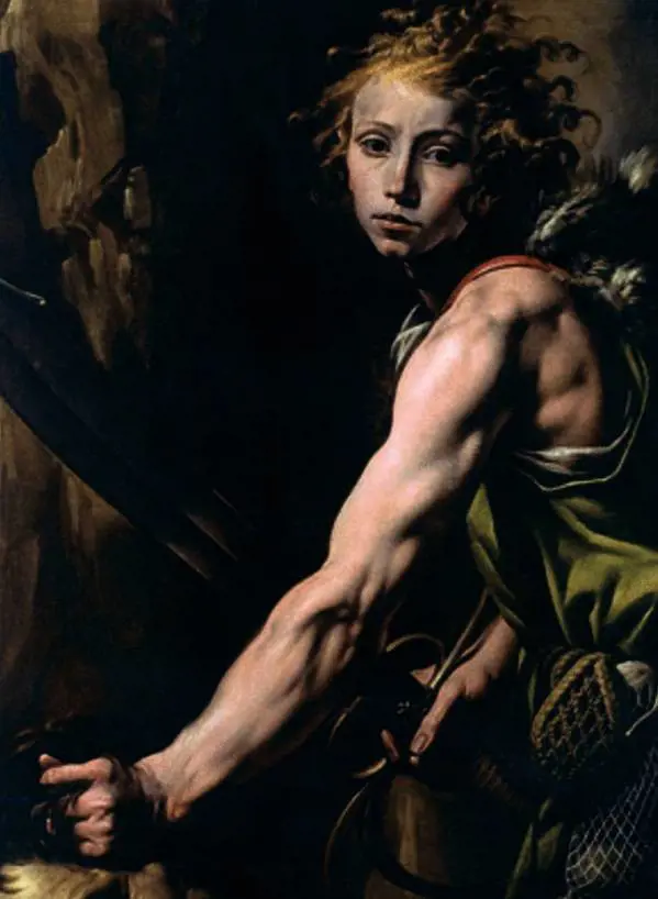 Parlo del David e Golia di Tanzio da Varallo conservato nella Pinacoteca della città di cui il pittore porta in giro il nome. È un ragazzo biondo con i capelli ricci, la pelliccia sulle spalle, il carniere da cacciatore e una sciabola affilata a Brescia, che, con il braccio teso e muscoloso, mostra la testa mozza, e già puzzolente, di Golia. È esattamente l'opposto dei bacchi lascivi e pigri di Caravaggio ma è anche il titolare di un altro primato.