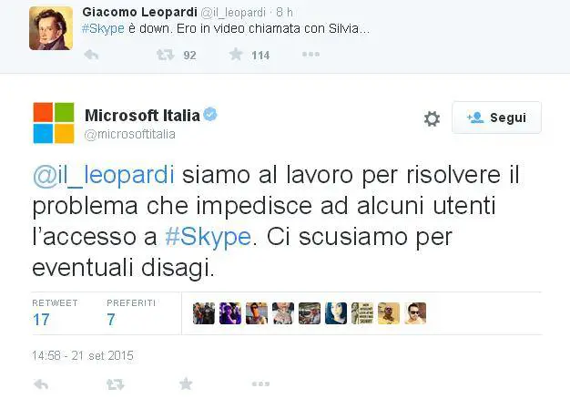 È quello che è successo a Microsoft Italia che nel caos in cui è piombata oggi ha risposto con un tweet anche a Giacomo Leopardi che si era lamentato del disservizio: "#Skype è down. Ero in video chiamata con Silvia…", ha scritto l'utente @il_leopardi. "Siamo al lavoro per risolvere il problema che impedisce ad alcuni utenti l’accesso a Skype. Ci scusiamo per eventuali disagi", ha replicato pronta l'azienda di Redmond.@il_leopardi siamo al lavoro per risolvere il problema che impedisce ad alcuni utenti l’accesso a #Skype. Ci scusiamo per eventuali disagi.