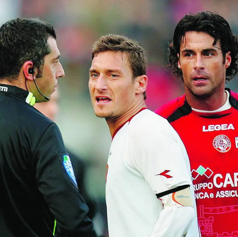 A quel punto – è il 47’ e manca ormai poco alla fine del match pareggiato dalla Roma - il cartellino rosso è inevitabile. Francesco Totti vomita di tutto al guardalinee, poi spinge via l’amico fraterno Vito Scala – preparatore della Roma e personale di Totti, anche in nazionale ai tempi di Lippi - che era andato a calmarlo come avviene sempre quando il capitano perde un po’ la testa. Scala cade pesantemente sul terreno di gioco, ma poi giustifica il nervosismo di Totti, che non veniva espulso dal 25 ottobre 2005 (Inter-Roma quando battibeccò con Veron). Prima, però, ci fu la maxisqualifica nell’annus horribilis giallorosso con i cinque allenatori in panchina. In quel caso per il fallo di reazione su Colonnese, che gli offese la moglie, ma lo provocò anche con altri gesti in campo. Si perde nella notte dei tempi (era l’inizio del disastroso europeo del 2004 con ct Trapattoni) lo sputo di Poulsen, per il quale Totti chiese scusa alla commissione Uefa dopo che una tv danese svelò il retroscena di quella partita.