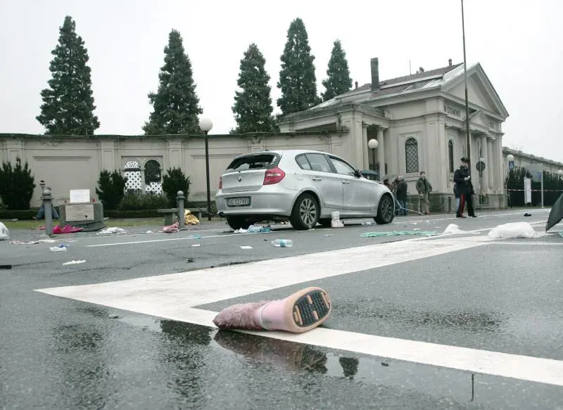 Lo schianto improvviso e terribile ha trasformato il vialone prima in un cinico campo di battaglia e poi in un triste luogo confuso surreale. Con gente a terra che urla, si lamenta, chiede soccorsi. Le pozze d’acqua sono rosse dal sangue. Sull’asfalto panini, borsette, scarpe. Ombrelli strapazzati. Ecco lì un doposcì rosa: è quello della bambina. I testimoni hanno raccontato che la Bmw serie 1 procedeva a velocità impressionante. Viaggiava contromano. Al volante P.F.M., 20 anni. Vive con la famiglia a Cesano, a poche centinaia di metri dal luogo del disastro. Impiegato in un’agenzia d’assicurazioni. Aveva passato la nottata con la fidanzata e gli amici al «Cappellaio Matto» di Giussano. Una serata come tante, parecchie risate, qualche bicchiere di troppo e via. Sul bolide, che quando schiacci è capace d’appiccicarti allo schienale. Il ventenne accompagna la ragazza e poi prende la strada di casa. Il rettilineo «invita» alla velocità. Neppure s’accorge del gruppo che si sta avviando verso i pullman. Neppure tocca il pedale del freno. L’auto si ferma solo dopo aver centrato la barriera umana. È l’inferno. Le vittime crollano come birilli. Quelli che sono scampati alla strage, cercano i parenti, gli amici: sono tutti sconvolti. Il ragazzo scende dalla Bmw, è intontito: «Non ho visto niente» dice. Il papà della bambina lo afferra per il collo. Rischia il linciaggio. I carabinieri giungono in tempo per strapparlo dalle grinfie dei più esasperati.