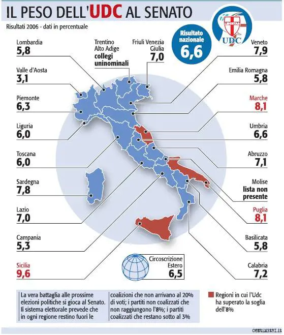 Solo in quella provincia, infatti, l’Udc valeva l’8,6. Mentre nella provincia di Barletta-Andria-Trani sono 14 su 20 i consiglieri che hanno lasciato Casini. Continua, poi, il lavorio di Giovanardi. Che a Como si è portato dietro il segretario provinciale Galli e tutto lo stato maggiore centrista. Come pure nella sua Modena, a Ferrara, a Rimini e nel resto dell’Emilia Romagna. Situazione simile in Toscana, in Veneto, in Calabria (in particolare Vibo Valentia) e in Molise (con il passaggio dell’ex deputato Di Giandomenico).