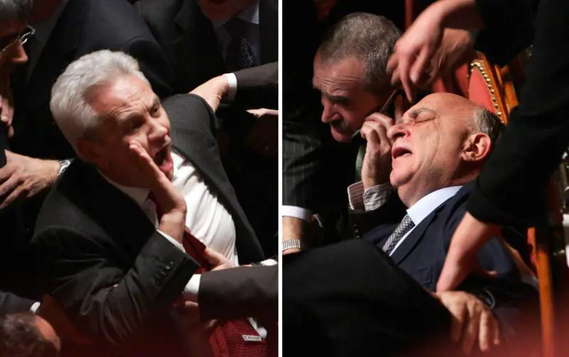 L'esponente del Campanile si dissocia dalla decisione presa dall'ufficio politico. Il capogruppo Barbato lo aggredisce in aula a Palazzo Madama: volano insulti e sputi. E Cusumano si sente male: guarda le immagini