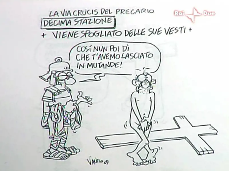 I suoi obiettivi, nella settimana di Pasqua, non potevano che essere i cattolici, sbeffeggiati nella serie dei quindici disegni sulla via crucis del precario, sciorinati dalla facente funzioni Fornario. A suon di «Cireneo del cazzo» e di «Ti licenzio a calci in culo» Vauro ha potuto, blasfemo qua e là, punzecchiare ancora una volta la sensibilità dei cattolici. Tra il lavoratore inchiodato e lo sboccato soldato romano non poteva certo mancare l’insulto a Berlusconi e alla sua famiglia. Ma questa è quasi prassi e oramai non fa ridere più nessuno. Meglio pestare duro sui credenti. D’altronde al vendicativo Vauro non dev’essere andata giù la «scomunica» dell’arcivescovo dell’Aquila Giuseppe Molinari che aveva osato criticare le sue bozze post sisma, in nome di una pietas tutta cristiana.