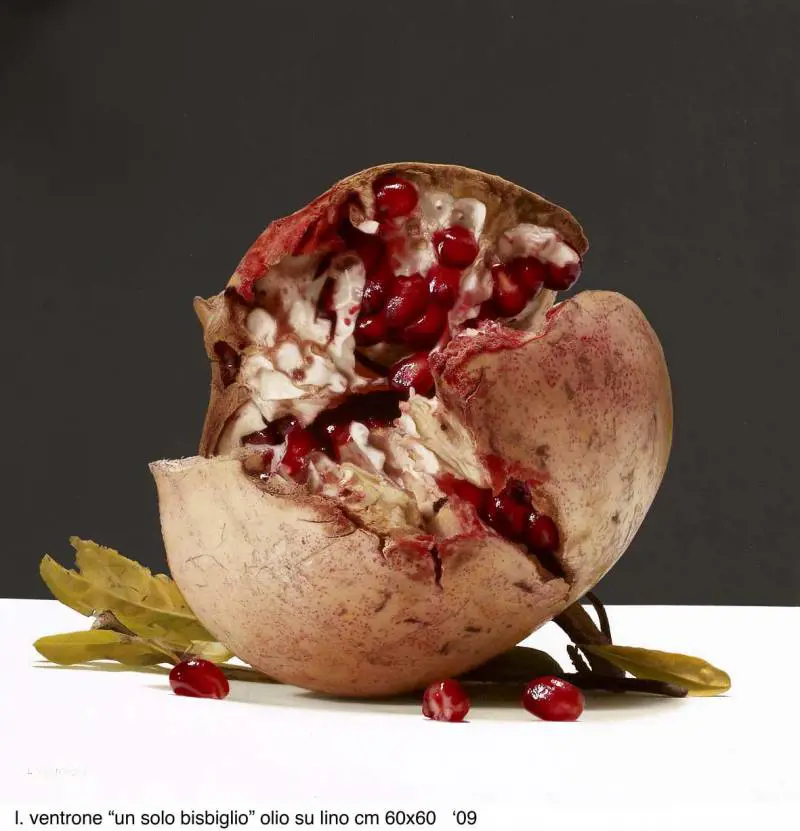 Ventrone sa che non potrebbe prescindere dalla fotografia che è lo specchio della realtà. Come lo era la pittura di Caravaggio prima della fotografia, anticipandola. Davanti alle opere (io lo so per prova quando guardo e ascolto chi vede di lui il mio ritratto) chiunque ha un motto di sorpresa e di istintiva ammirazione, che può ribaltarsi in irritazione, per il mestiere e per la dipendenza dall’immagine fotografica. Ma è dipendenza o è indipendenza? E non è una forma di rianimazione della fotografia? La questione è difficile; ma è vero che, nelle nature morte soprattutto, nelle frutta rutilanti, nei melograni (nella foto, «Un solo bisbiglio», 2009), nelle uve, contro fondi neri, Ventrone sembra cercare un assoluto della realtà, una essenza, una entelechia che nell’opera accresce la realtà, non si limita a riprodurla. È di più. Ventrone è il pittore dell’iperbole. E iperboliche, esagerate, barocche, appunto, sono le sue pitture, piuttosto che iperrealistiche. Ventrone esagera, perfeziona il reale, anche nelle sue imperfezioni. E ci costringe a fare i conti con immagini che non ci avrebbero, al di fuori della sua interpretazione, interessato. La sua pittura è «stereofonica», e potenzia la realtà .