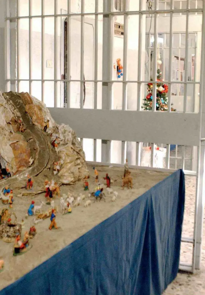 Ci sono delle sezioni elevate a monumento nazionale: sono entrate nel nostro immaginario coi film anni ’50, con le porte di legno spesso, le ringhiere, il cortile per l’ora d’aria. Ma c’è qualcosa di ancora più monumentale e storico, anche se fresco come le cose dei bambini insegnate loro dai vecchi: il presepio. Dietro le sbarre c’è una gemmazione di gesubambini, capanne e asinelli.