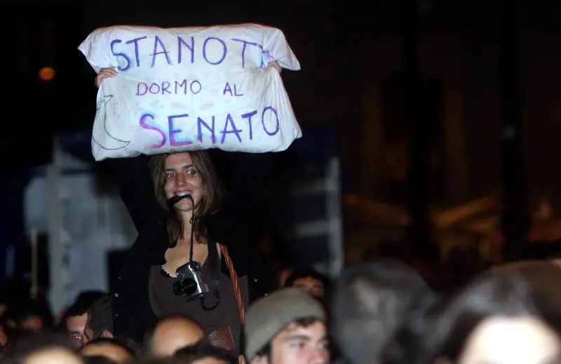 RomaDalle stanze del Senato, le grida arrivavano lontane ma salivano di tono ogni volta che qualcuno, alle grandi finestre, si sporgeva o spostava una tenda. «Ladri!». «Buffoni!». «C’avete solo la mafia!». Pioveva a dirotto ieri pomeriggio mentre il corteo dei ragazzini delle superiori che già dalla mattina aveva fatto picchetto tra piazza Navona e corso Rinascimento si univa con quello degli universitari della Sapienza. Il grande ingresso di Palazzo Madama era presidiato dalla polizia, la via chiusa, il traffico del centro di Roma bloccato, tutti gli accessi verso piazza Navona sbarrati dagli agenti in tenuta antisommossa, i turisti spariti dai bar di fronte alle fontane del Bernini.
