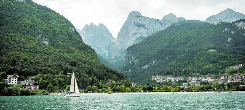 C'è un momento, in primavera, in cui il Lago di Molveno abbandona le atmosfere ovattate e un po' nostalgiche dell'inverno e si apre a una stagione di luce e movimento: i prati tornano a brillare di verde, le acque si fanno scintillanti, le Dolomiti di Brenta si riflettono come in uno specchio appena lucidato. A circa 845 metri di quota, questo lago alpino - che si trova a una quarantina di chilometri di distanza a nord-ovest da Trento - rivela il suo equilibrio naturale, nato migliaia di anni fa da uno sbarramento di frana e oggi disteso per oltre tre chilometri quadrati, con profondità che superano i 120 metri e una qualità dell'acqua così alta da conquistare le Cinque Vele di Legambiente e Touring Club e il titolo di «Lago più bello d'Italia» diverse volte. Il primo approccio è spesso dal versante nord, dove il Lido di Molveno concentra servizi e spazi attrezzati: ampi prati, aree gioco, campi sportivi.
