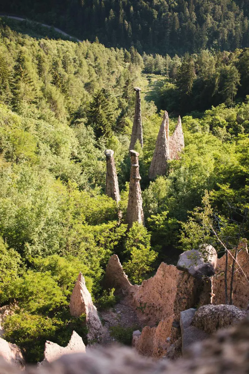 Imponenti, magnetiche, quasi irreali: le Piramidi di Segonzano si alzano come una visione scolpita dal tempo nel cuore della Val di Cembra, poco distanti dal Lago Santo, e catturano lo sguardo con le loro forme slanciate. Torri e pinnacoli disposti a canna d'organo, colonne sottili coronate da massi di porfido, che sembrano sospesi in equilibrio sicuro e precario allo stesso tempo. Formano un capolavoro naturale che, nato dai depositi morenici dell'ultima glaciazione, oggi è considerato un fenomeno raro nel mondo, capace di coniugare spettacolo e valore didattico in un paesaggio che invita a essere esplorato lentamente. Il sito, visitabile tutto l'anno grazie a un percorso attrezzato e ben segnalato, diventa nella bella stagione una meta ideale per escursioni e weekend, soprattutto seguendo il Sentiero Europeo E5, che può essere reinterpretato in chiave gustosa, perché intreccia natura e tradizione enogastronomica in un itinerario che parte dall'abitato di Faver, piccolo borgo dove sopravvive un'autenticità rara, raccontata da realtà come la Distilleria Paolazzi, la Macelleria Paolazzi e la Locanda del Passatore, tappe che trasformano il cammino in un'esperienza culinaria oltre che paesaggistica. Da qui il sentiero scende lungo l'antica via della Corvaia, seguendo l'E5 fino al ponte di Cantillaga sull'Avisio, per poi proseguire verso Piazzo, con una deviazione che passa per i ruderi del Castello di Segonzano, affaccio privilegiato sui vigneti terrazzati e luogo intriso di memoria, mentre la cappella di Sant'Antonio accompagna verso il paese, dove vale la pena visitare la chiesa dell'Immacolata e il palazzo Baroni a Prato con la sua cantina, ulteriore invito a scoprire i sapori del territorio. L'itinerario può chiudersi qui oppure continuare verso Stedro, dove la Distilleria Giacomozzi introduce a uno dei passaggi più suggestivi, il punto panoramico che domina dall'alto le Piramidi di Terra, regalando una prospettiva panoramica che amplifica la forza di questo paesaggio modellato dal tempo e dagli elementi.