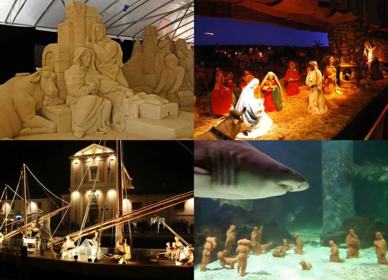 Al Parco Le Navi di Cattolica Da domenica 23 dicembre ci saranno grandi squali toro e una miriade di pesci a “vegliare” sulla Sacra Famiglia e i pastori, realizzati in terracotta da un artigiano locale e immersi un una vasca da 700.000 litri d’acqua. All’acquario cattolichino si potranno poi ammirare tante altre rappresentazioni sommerse della natività, da quello in vetro soffiato accolto nell’habitat delle meduse, a quelli di terracotta tra gli squali e i cavallucci marini, passando per il presepe inciso sulla pietra del fiume Conca immerso nella vasca dei cuccioli di razza, nati da pochi mesi fa all’Acquario.