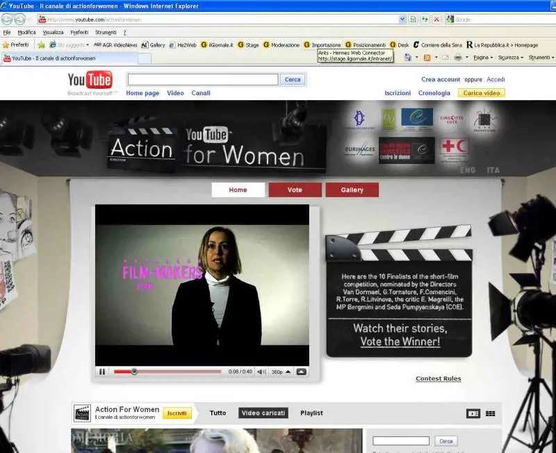 Su YouTube, il concorso "Action for Women" per aspiranti registi di 11 Paesi europei (Italia, Repubblica Ceca, Francia, Germania, Gran Bretagna, Irlanda, Olanda, Polonia, Russia, Spagna e Svezia) è nato per raccontare in un cortometraggio inedito il grave problema sociale della violenza contro le donne. Un'iniziativa lanciata alla Mostra del Cinema di Venezia dove è stata presentata dalla showgirl Michelle Hunziker, madrina dell’iniziativa, e l'onorevole Deborah Bergamini, deputato del PdlL e membro del Consiglio d'Europa, in collaborazione con Cinecittà Luce e CSC Production.